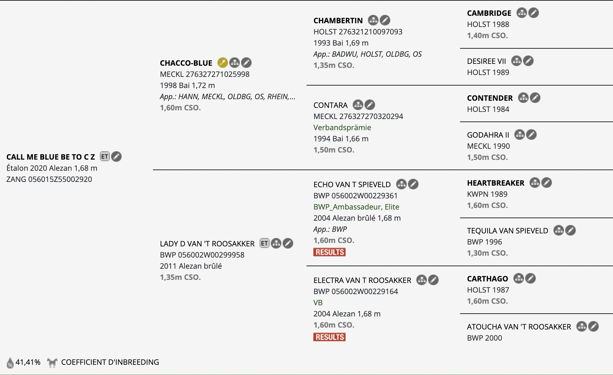 Vous découvrirez via le lien Horse TELEX ci-dessous le pedigree complet avec mention des niveaux de sport des parents, grands-parents et arrières grands-parents; le pourcentage de pur-sang ainsi que les prestations du cheval.