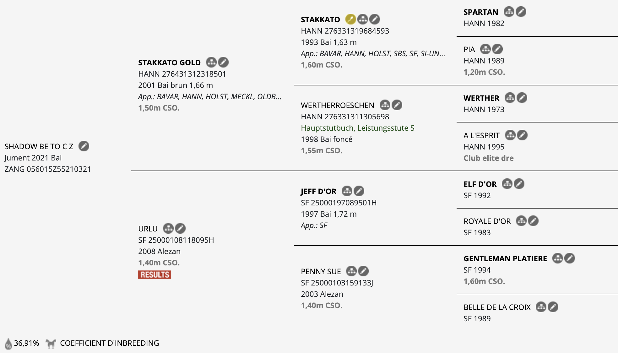 Vous découvrirez via le lien Horse TELEX ci-dessous le pedigree complet avec mention des niveaux de sport des parents, grands-parents et arrières grands-parents; le pourcentage de pur-sang ainsi que les prestations du cheval.